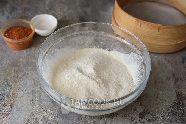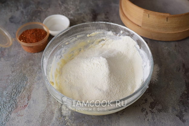 Дрожжевую смесь выложим в миску, добавим соль и просеем 2-3 ст.л. муки. Перемешаем.