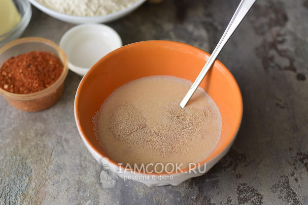 В миску зальем теплое молоко, добавим сахар и дрожжи. Перемешаем и оставим на 10 минут в покое.