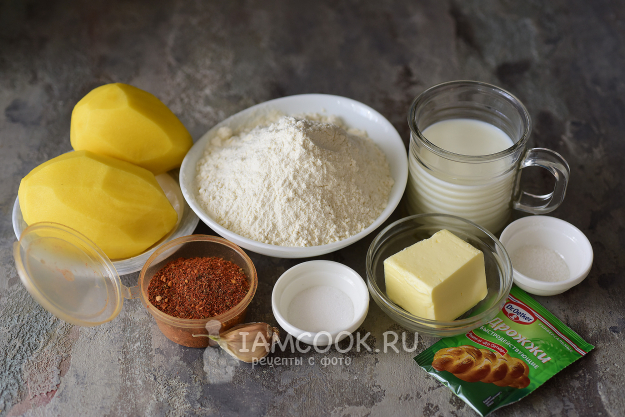 Подготовим ингредиенты для открытого дрожжевого пирога с картошкой. Молоко чуть подогреем в сотейнике - примерно до 35 градусов. Чеснок почистим. Масло сливочное растопим на маленьком огне в кастрюльке.