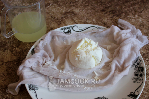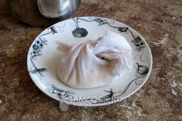 Привяжите концы марли, например, за ручку кастрюли так, чтобы масса не соприкасалась с дном, а сыворотка капала и собиралась на дне. Периодически подкручивайте место стягивания марли, чтобы лучше отжималось.