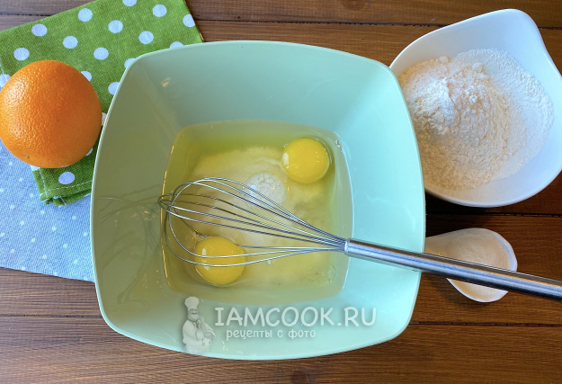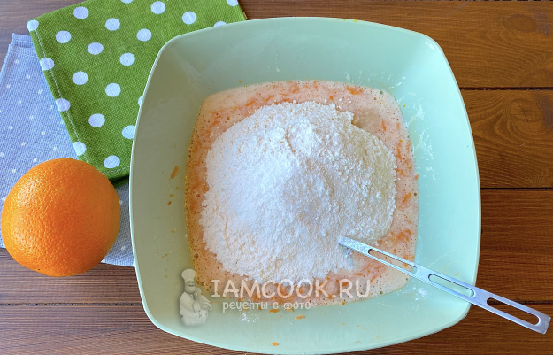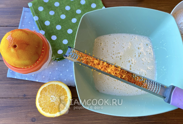 Добавьте цедру и сок одного апельсина, перемешайте.