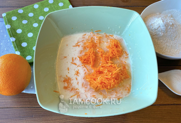 Далее натрите морковь на мелкой терке и отожмите лишний сок, выложите в жидкую смесь, перемешайте.
