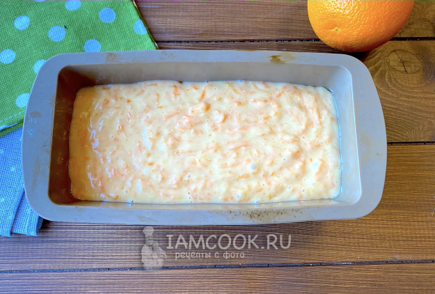 Форму для выпечки смажьте маслом и влейте тесто. Имейте в виду, кекс увеличивается в два раза.