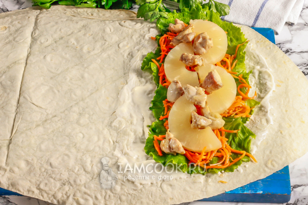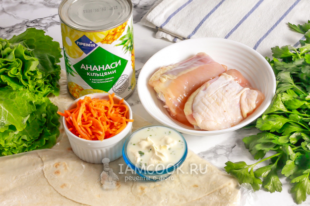 Подготовьте необходимые ингредиенты для создания румяной шаурмы с курицей и ананасами в домашних условиях.