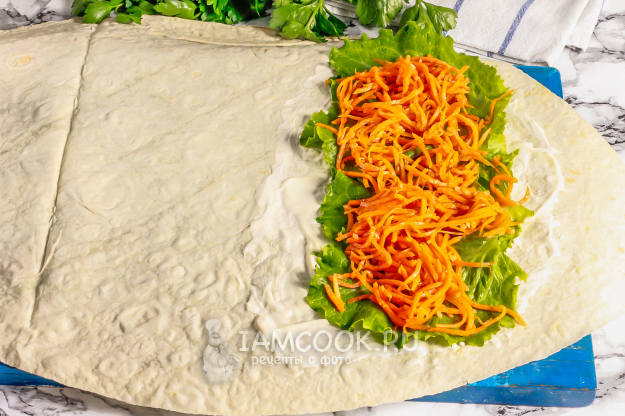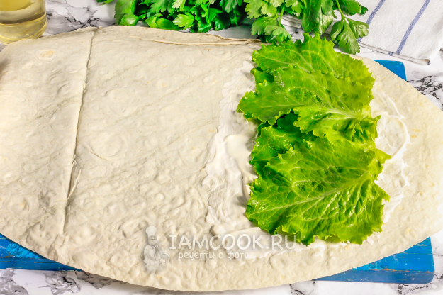 Разверните на доске или рабочей поверхности лист лаваша. Желательно использовать тонкий длинный лаваш, но если у вас они круглые и короткие, то просто наслоите один на другой. Смажьте край лаваша выбранным соусом. Промойте листья салата и выложите на соус.