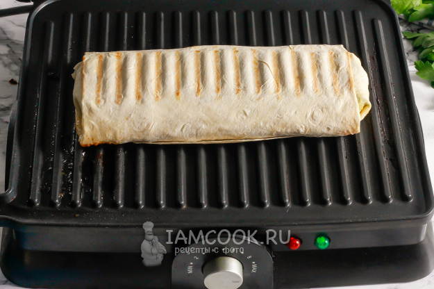 Прогрейте электрогриль или сковороду-гриль и выложите заготовку на панель. Обжарьте примерно 2-3 минуты, до румяных подпалин. Если делаете это на сковороде, то сверху прижимайте заготовку грузом: другой сковородкой, кастрюлей и т.д.