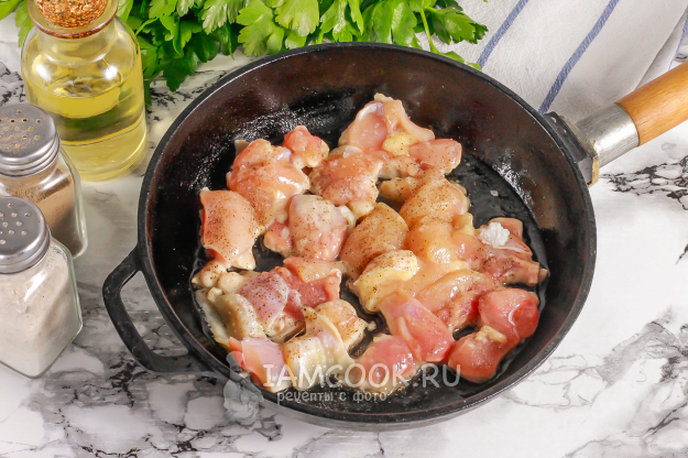 С бедра или с другой промытой части курицы срежьте мякоть и нарежьте его порционными кусочками. Можно использовать обычное филе. Прогрейте на сковороде растительное масло и обжарьте в нем кусочки курицы до румяности примерно 5-10 минут. Обязательно посолите и поперчите их.