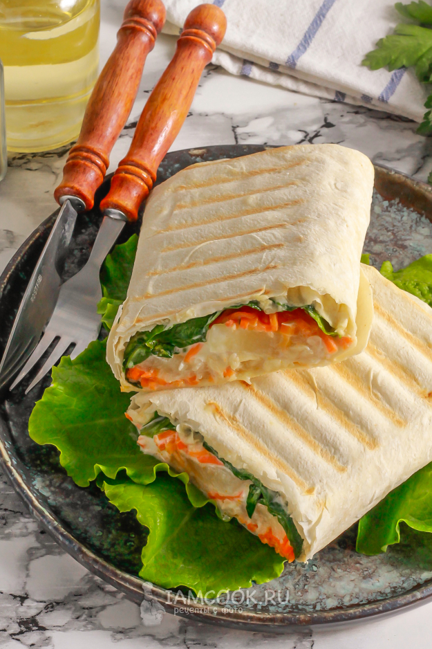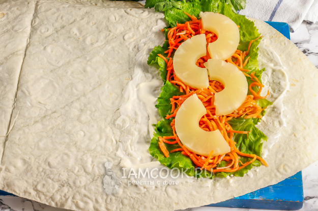 Затем хрустящую шаурму с курицей и ананасами разрежьте пополам и подайте к столу горячей. Не забудьте про соус.