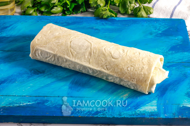 Подверните край лаваша внутрь, затем боковые края. Скатайте лаваш с начинкой рулетом. Старайтесь это сделать так, чтобы начинка не вывалилась.