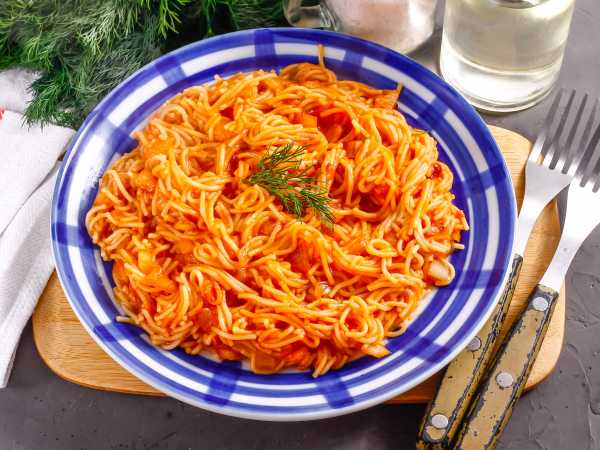 Для приготовления макарон с колбасой и луком подготовьте продукты по списку.