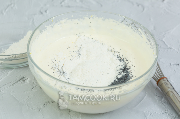 Затем в несколько приёмов введите муку, смешанную с разрыхлителем и маком.