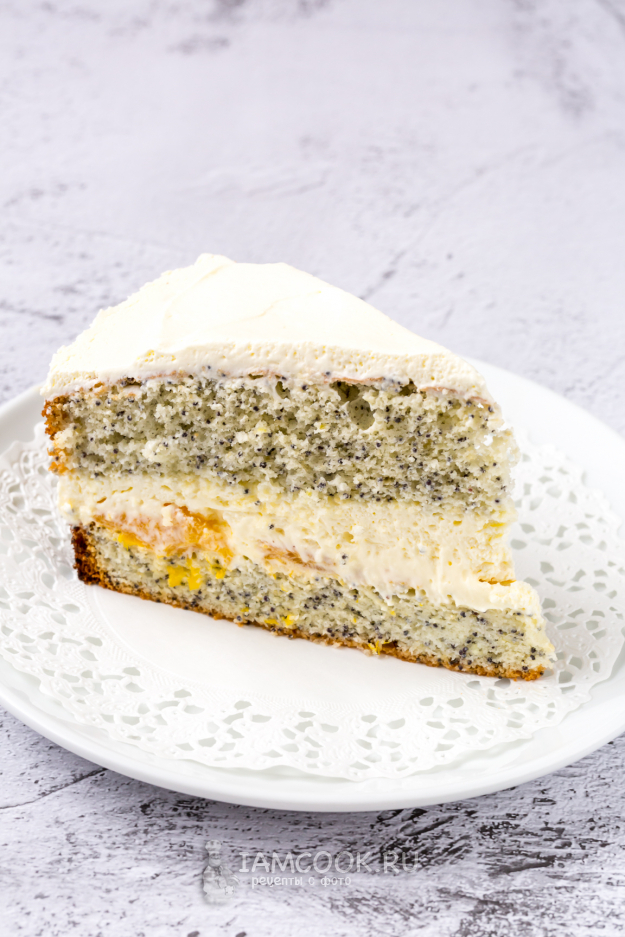 И вот кусочек торта из лимонно-макового бисквита с кремом из взбитых со сгущенкой сливок с манго.