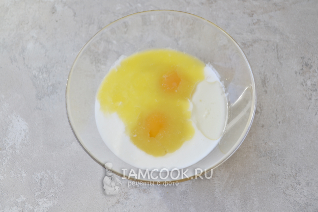 В другую миску влейте кислое молоко, разбейте яйца, добавьте растопленное сливочное масло и растительное масло.