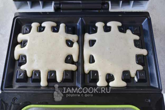 Разогрейте электровафельницу. Если необходимо, то смажьте панели растительным маслом. Налейте тесто (примерно по 1,5-2 ст.л. на одну вафлю).