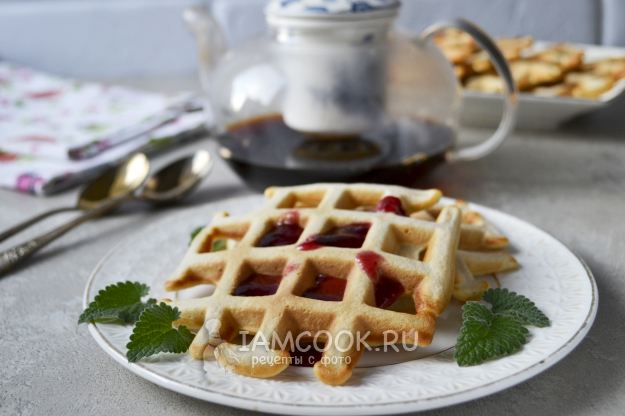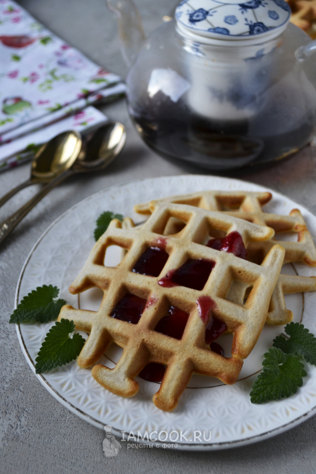 Подавайте вафли на кислом молоке с вареньем, сгущенным молоком, любым другим сладким соусом к чаю, кофе. Только что испеченные вафли очень мягкие, нежные. Остывшие вафли становятся более плотными.