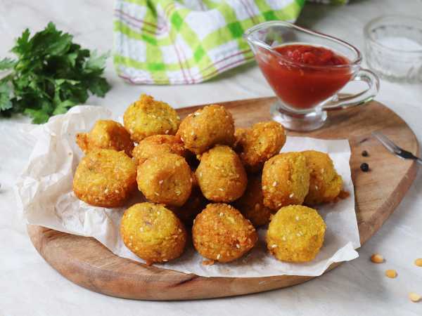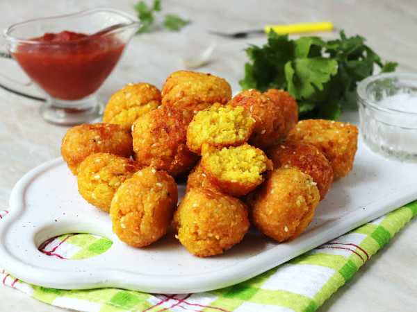 В сотейнике разогреем на среднем огне растительное масло. Поочередно будем опускать шарики из нута - обжарим каждый со всех сторон.