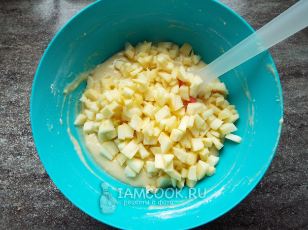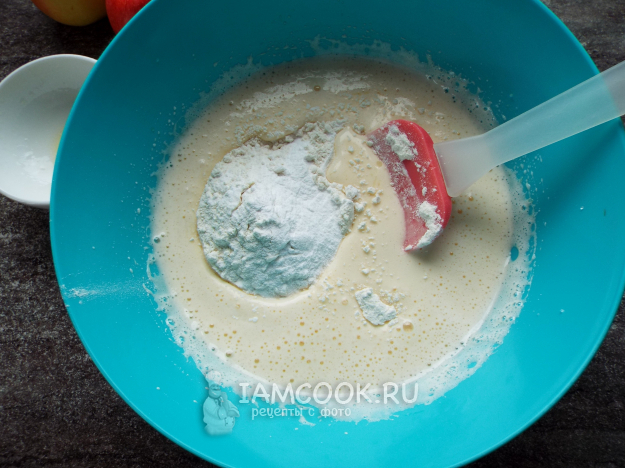 Аккуратно перемешать лопаткой и сразу всыпать муку и разрыхлитель.