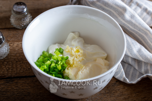 Для заправки салата смешайте в глубокой миске сметану, майонез, измельчённый чеснок и нарезанный зелёный лук. Перемешайте, добавьте по вкусу соль и молотый чёрный перец.