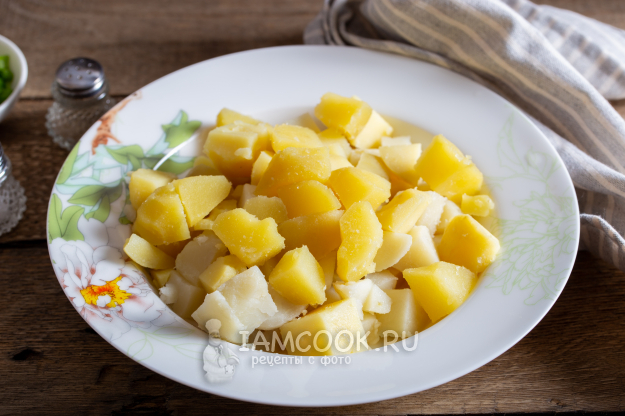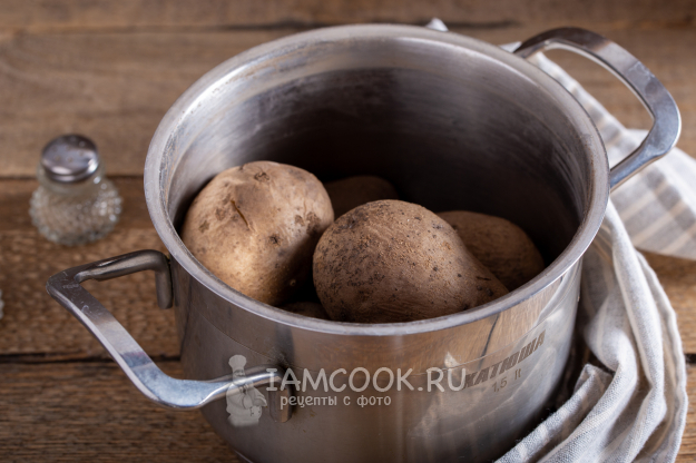 Для салата выбирайте сорта картошки с небольшим содержанием крахмала и среднего размера. Картофель помойте и выложите в кастрюлю, залейте водой и поставьте на огонь. Доведите воду до кипения и варите на среднем огне картофель около 20 минут. С готового картофеля слейте воду и остудите его.
