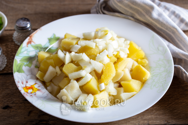 Репчатый лук очистите и порежьте мелким кубиком. Добавьте к картофелю.
