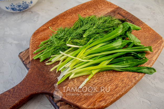 Возьмите все необходимые ингредиенты для приготовления лепешек с творогом и черемшой на сковороде.