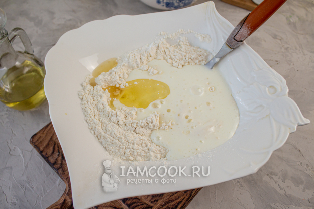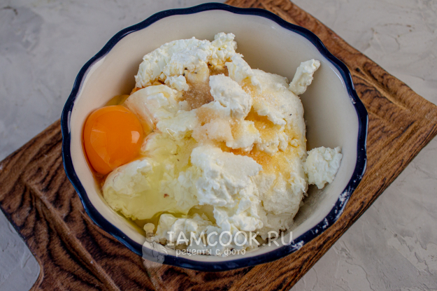 Для начинки в подходящую посуду выложите творог, добавьте яйцо, соль и черный молотый перец. При помощи вилки перемешайте.