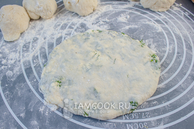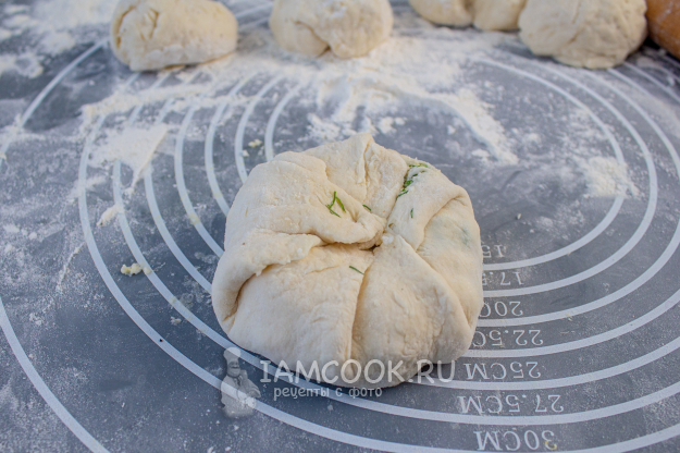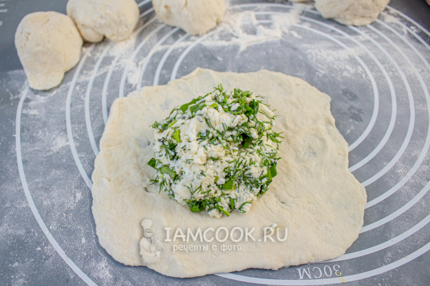 Тесто разделите на 6-8 равных частей. Скатайте каждую часть в шарики. Поверхность стола припылите мукой, возьмите один шарик теста и раскатайте его в тонкий круглый пласт. В середину выложите часть начинки.