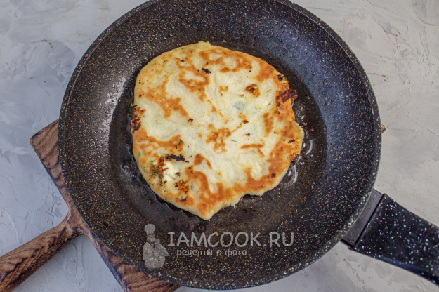 Сковороду нагрейте, влейте немного масла. С лепешки стряхните остатки муки и выложите на сковороду. Обжаривайте на умеренном нагреве (чуть ниже среднего) с одной стороны 3-4 минуты, затем переверните лепешку лопаткой и обжаривайте еще 2-3 минуты со второй стороны под крышкой.
