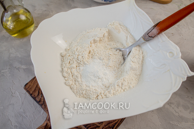 Начнем с приготовления теста. В миску просейте муку, добавьте соль и разрыхлитель, перемешайте.