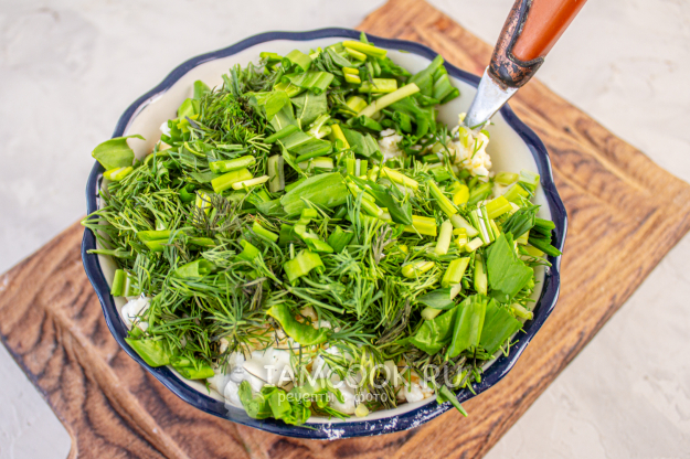 Зелень нарежьте мелко и добавьте к творогу, перемешайте.