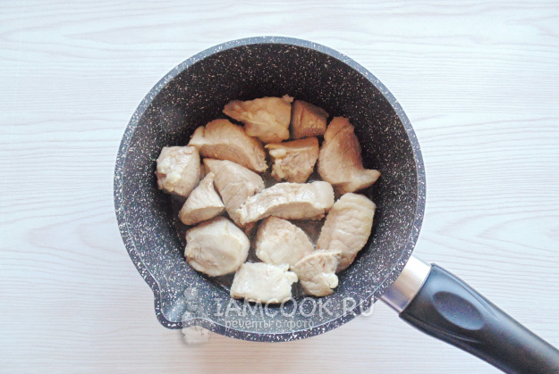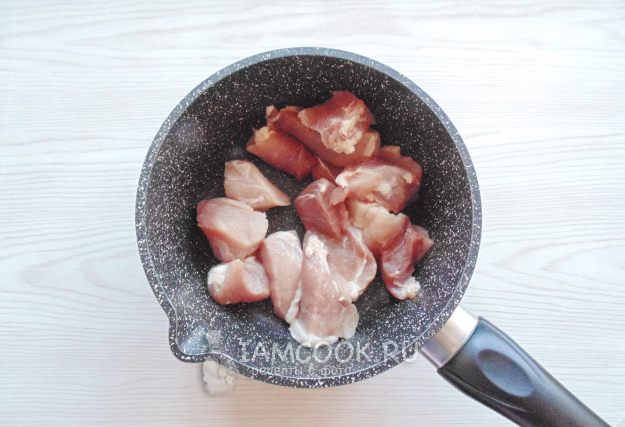 Свинину помойте, нарежьте небольшими кусочками и выложите в кастрюлю или сковороду с толстым дном.