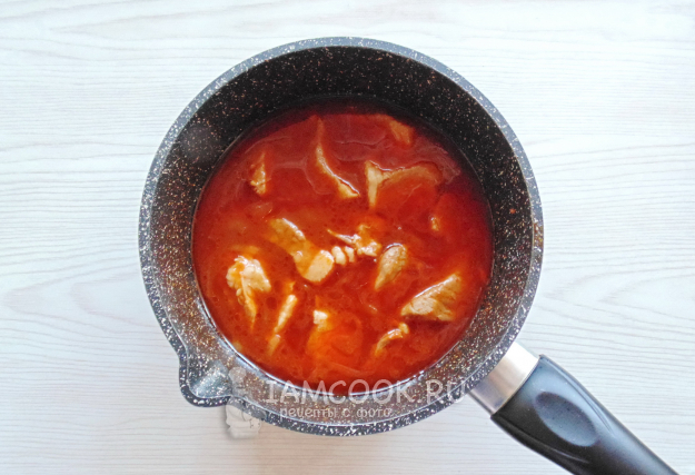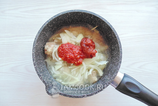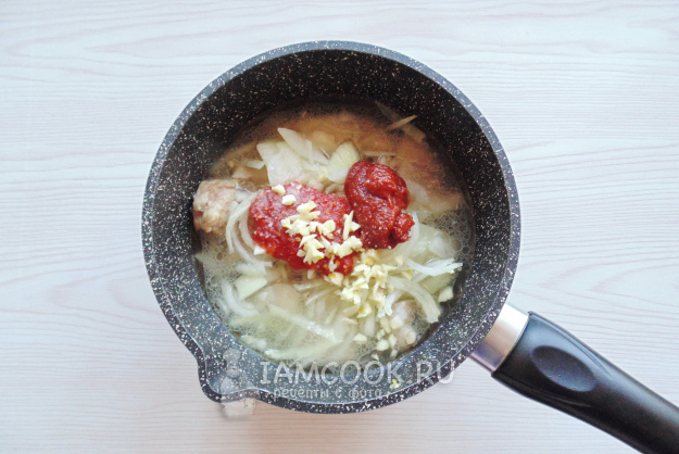 Налейте в кастрюлю воду так, чтобы она полностью покрывала свинину. Помидоры измельчите любым способом и выложите в кастрюлю, добавьте томатную пасту.