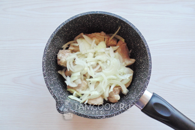 Репчатый лук очистите, помойте и нарежьте полукольцами. Добавьте в кастрюлю с мясом.