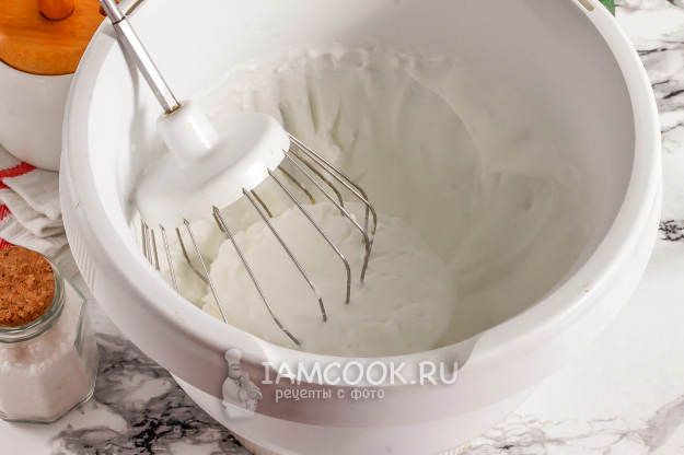 Белки я соединила и взбила в чаше кухонного комбайна за 2-3 минуты в пышную пену с 1 ч.л. сахарного песка.