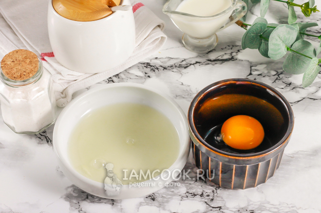 Аккуратно разбейте куриное яйцо, отделите желток от белка и выложите в разные емкости.