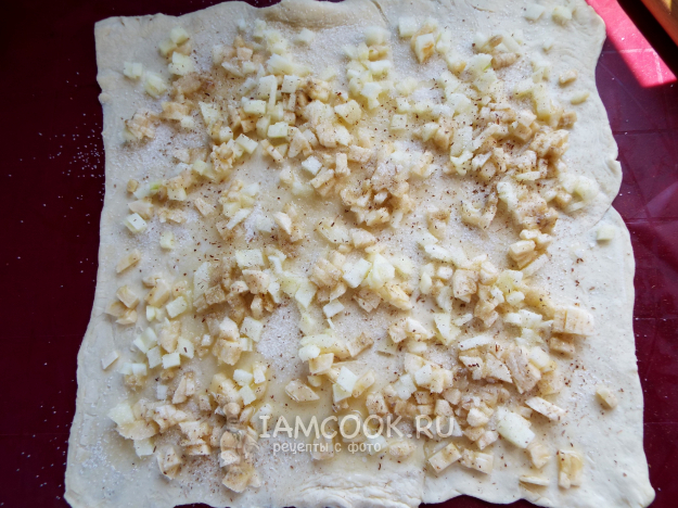 Смазать сливочным маслом, посыпать сахаром, разложить фрукты, сверху посыпать корицей.