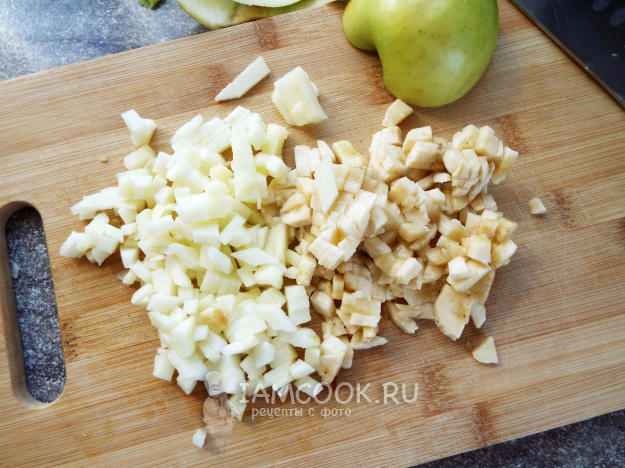 Яблоко и банан нарезать мелким кубиком.