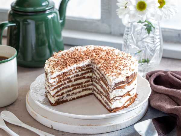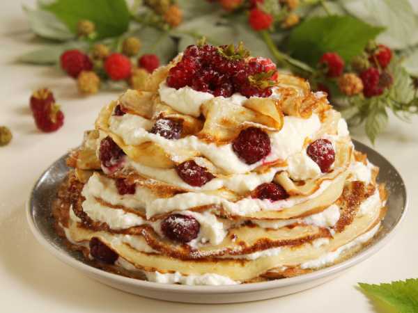 Собрать торт, чередуя блины с кремом. Поставить в холодильник для стабилизации на ночь.