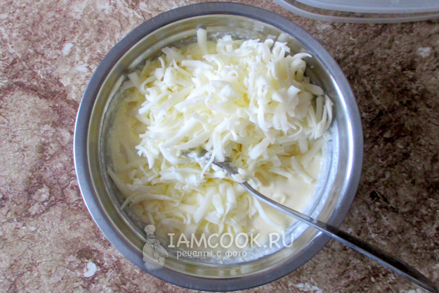 Добавьте тертый сыр и соду (гасить не надо, она среагирует с кислой средой).
