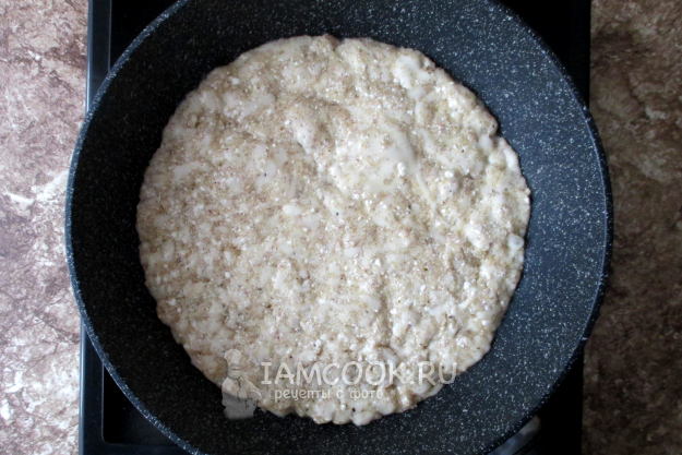 Затем перевалите тесто на разогретую сковороду, слегка смазанную сливочным или растительным маслом. Разровняйте ложкой или руками, закройте крышкой.