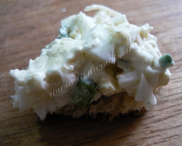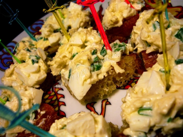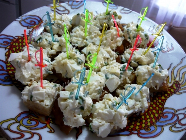 От салата остались варёные яйца и немного сыра, а на грядке уже есть перья лука. Недолго думая, я сотворила вот такие канапе. Вряд ли они отличаются оригинальностью, однако и другим не уступают.