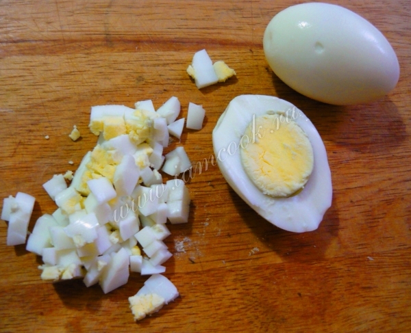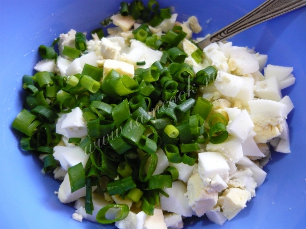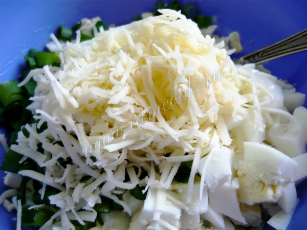 Хлеб пока оставим в покое и займёмся начинкой. Для этого яйца накрошим кубиками, лук мелко порубим и натрём на мелкой тёрке сыр.