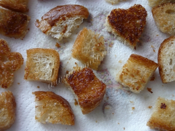 Хлеб необходимо нарезать на маленькие кусочки и обжарить с одной стороны на сковороде до образования корочки. С помощью бумажного полотенца уберём лишнее масло.