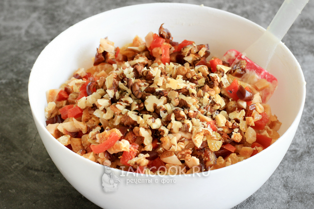 Добавьте в тесто подготовленные сухофрукты и орехи, размешайте.