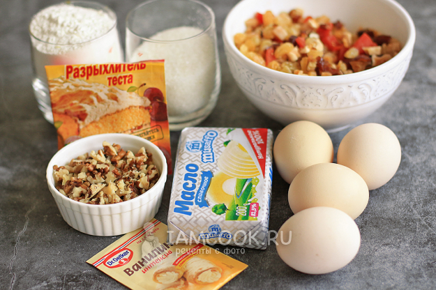 Чтобы испечь кекс «Мазурка» с сухофруктами и орехами, заранее подготовьте все необходимое по списку. Сливочное масло выдержите при комнатной температуре до его размягчения. Сухофрукты тщательно промойте и нарежьте помельче. У меня это цукаты из тыквы, светлый изюм, инжир, финики и грецкие орехи. Орехи нужно порубить ножом отдельно от влажных сухофруктов.