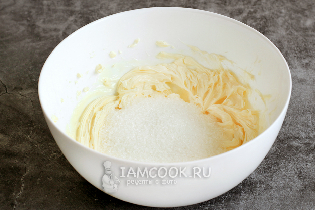 Масло взбейте миксером добела, затем добавьте сахар и снова все взбейте.