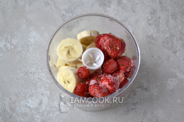 Спелый банан очистите, произвольно нарежьте, сложите в чашу блендера. Добавьте к банану клубнику. Замороженной ягоде дайте немного времени, чтобы она оттаяла.