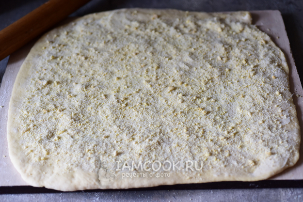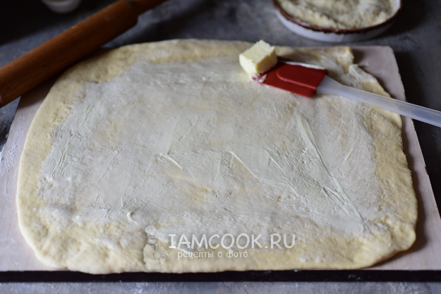 Рабочую поверхность чуть присыплем мукой, раскатаем тесто в прямоугольный пласт по возможности. Масло для смазывания теста должно быть предельно мягким, поэтому его лучше достать из холодильника заранее. Пласт теста смажем мягким сливочным маслом.