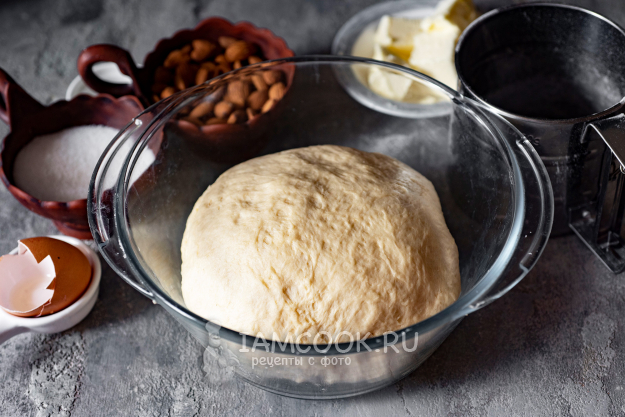 Замесим мягкое тесто, не прилипающее к рукам. Корректируйте самостоятельно консистенцию теста, подсыпая дополнительно понемногу муку, если возникнет необходимость. Тесто округлим в миске, накроем кухонным полотенцем и оставим в теплом месте подходить примерно на 60 минут.