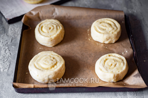 На противень, застеленный пергаментом для выпечки, выложим заготовки булочек, располагая их на значительном расстоянии друг от друга, оставим на 15 минут в покое, а затем смажем взболтанным яйцом, воспользовавшись кондитерской кисточкой.